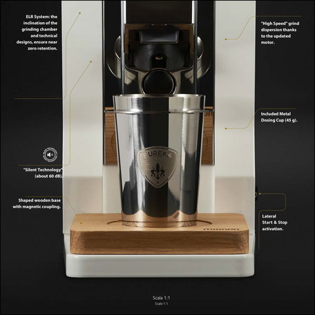 DieEureka Mignon Single Dose aus der neuen Eureka Oro Line ist eine Kaffeemühle mit dem bewährten Design der Mignon Reihe verbunden mit der Mahlwerkstechnik der deutlich größeren Modelle.